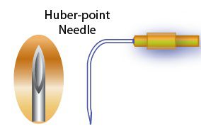 Huber needle has a deflected tip which will not core and thus preserve integrity of silicone in a chemoport