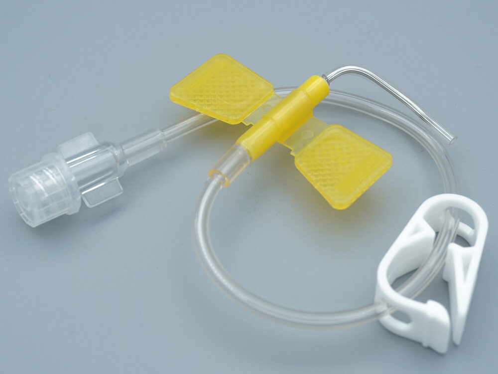 Huber needle with wings, catheter and clamp – is used to puncture the skin and access the port